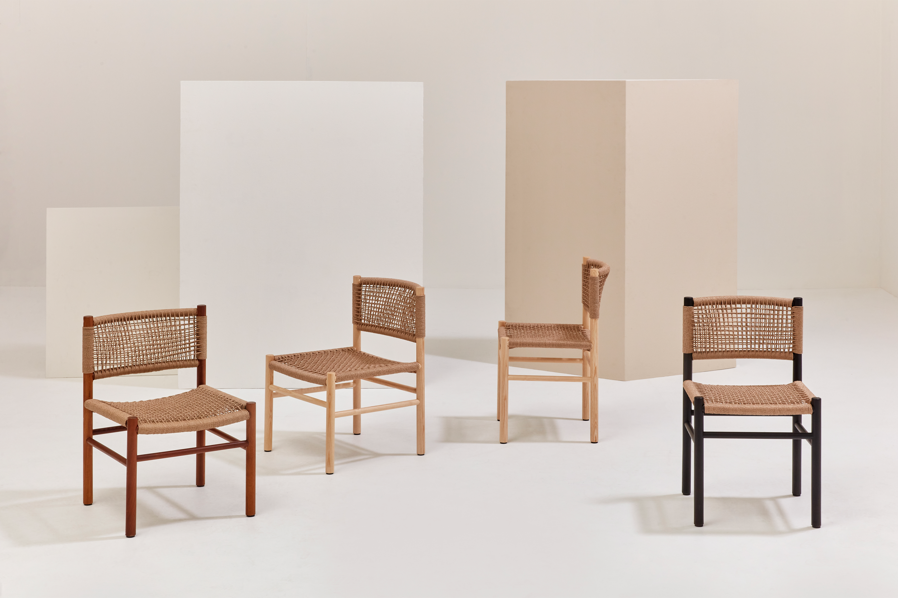 MATERIALS | Frame: Solid ashwood, iroko. Frame Finish: Wood stain, matt lacquer, coloured stain. Seat + Backrest: Woven cellulose cord. Glides: PVC custom.