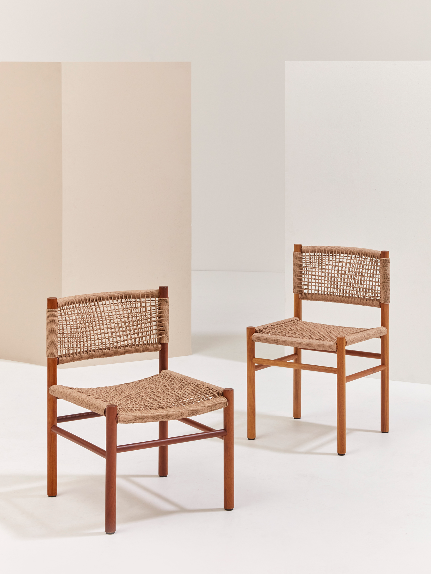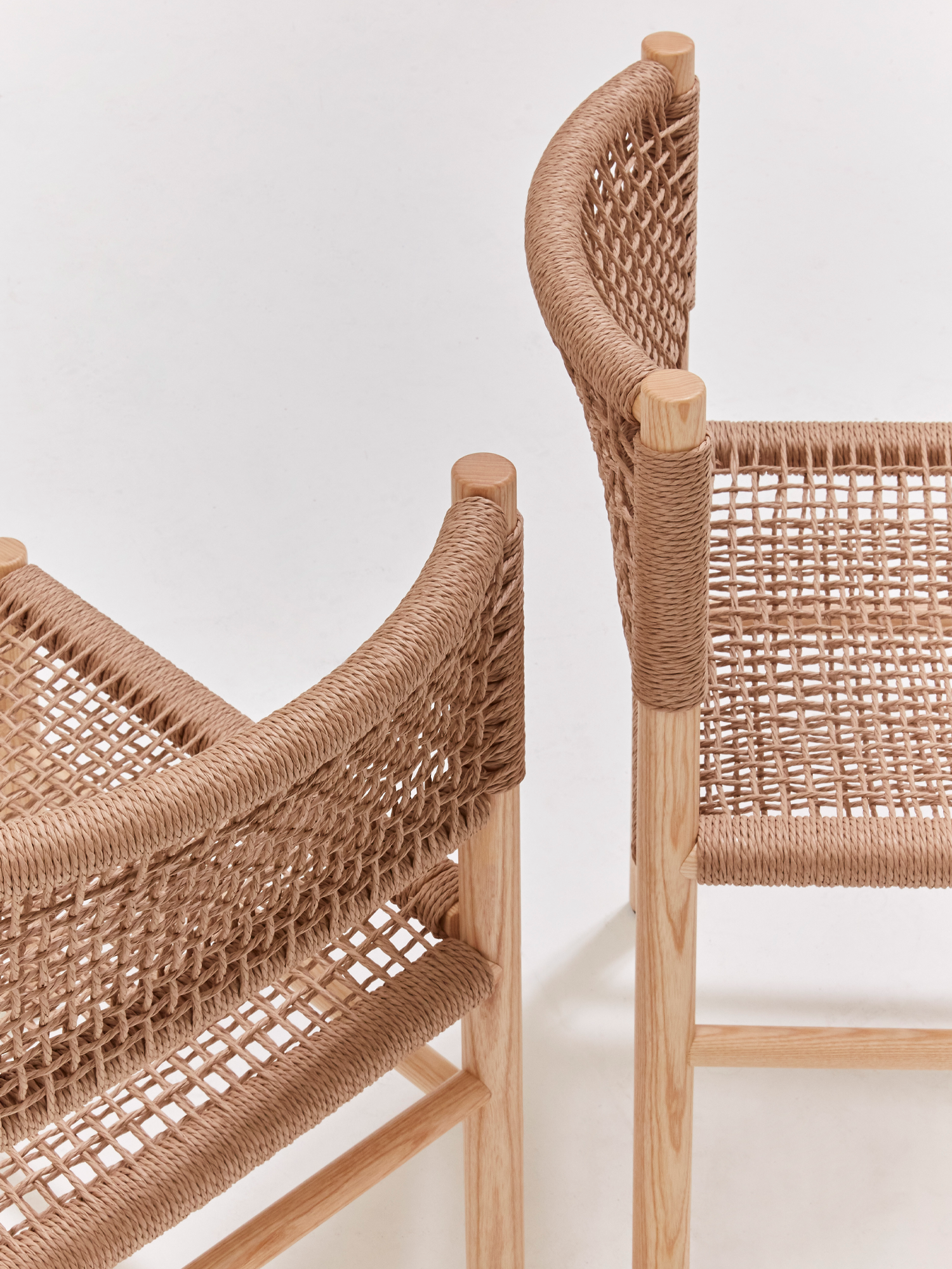 MATERIALS | Frame: Solid ashwood, iroko. Frame Finish: Wood stain, matt lacquer, coloured stain. Seat + Backrest: Woven cellulose cord. Glides: PVC custom.