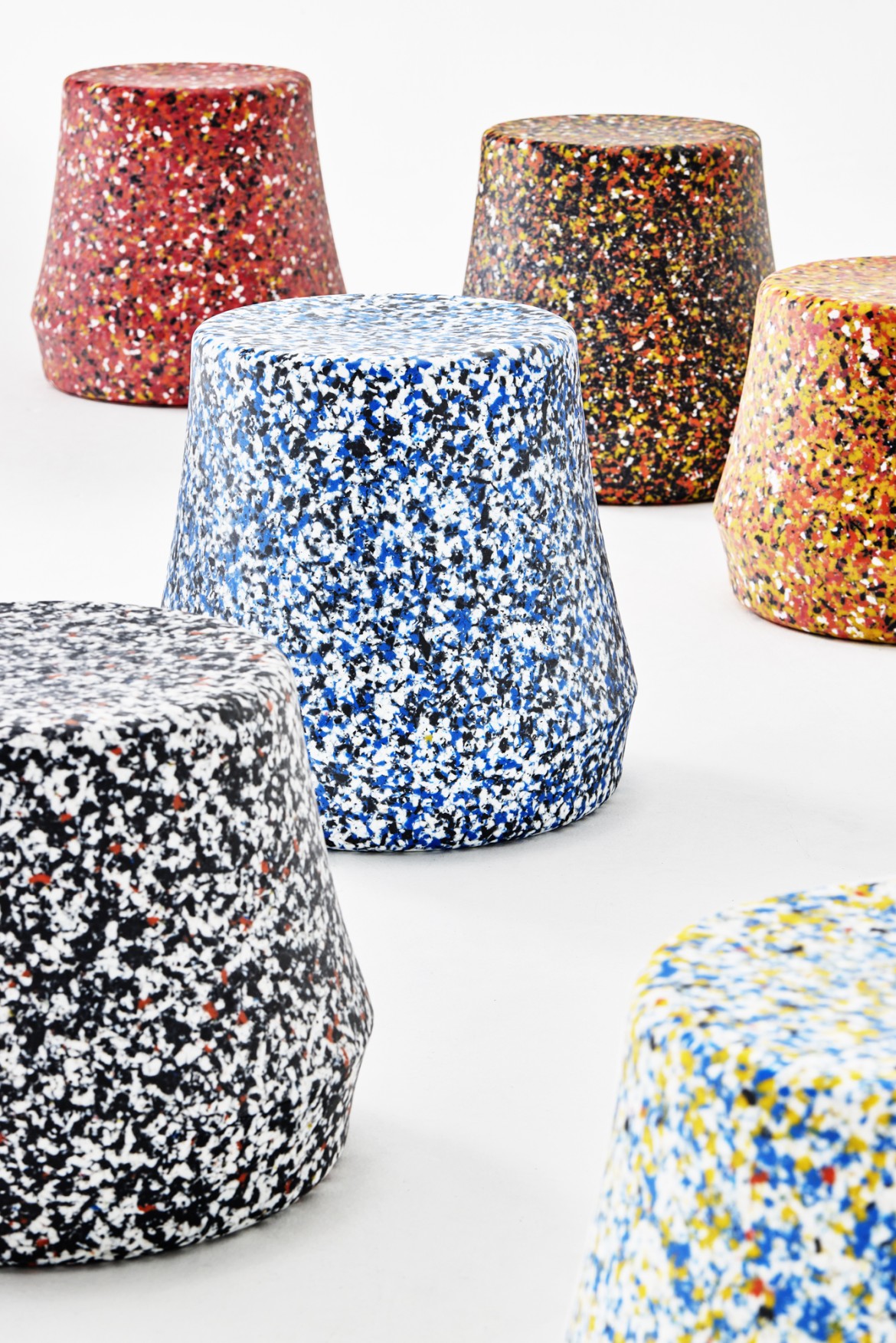 The terrazzo-like design accentuates the stool's recycled origins. While standard colour options offer a touch of vibrant playfulness,