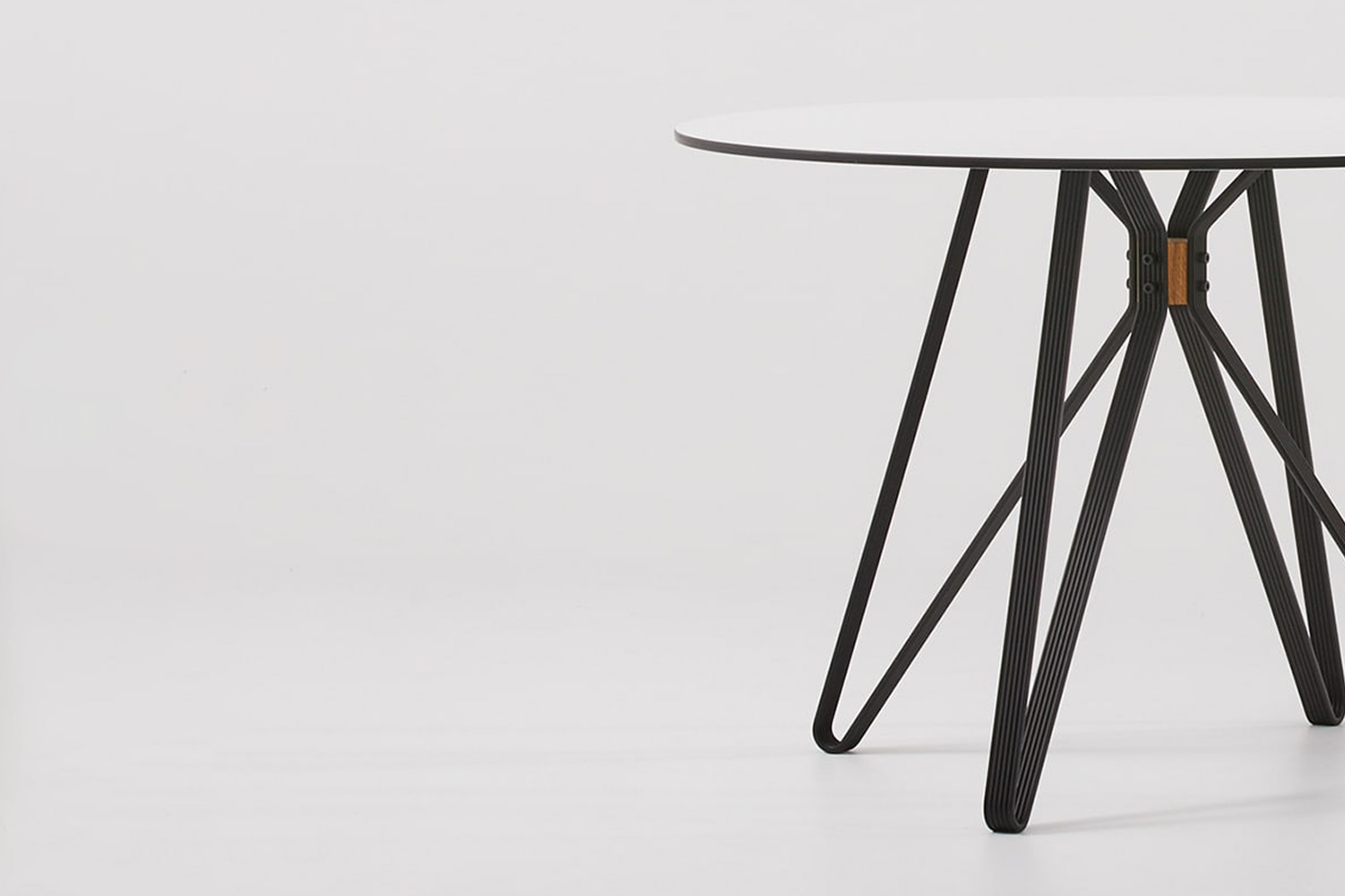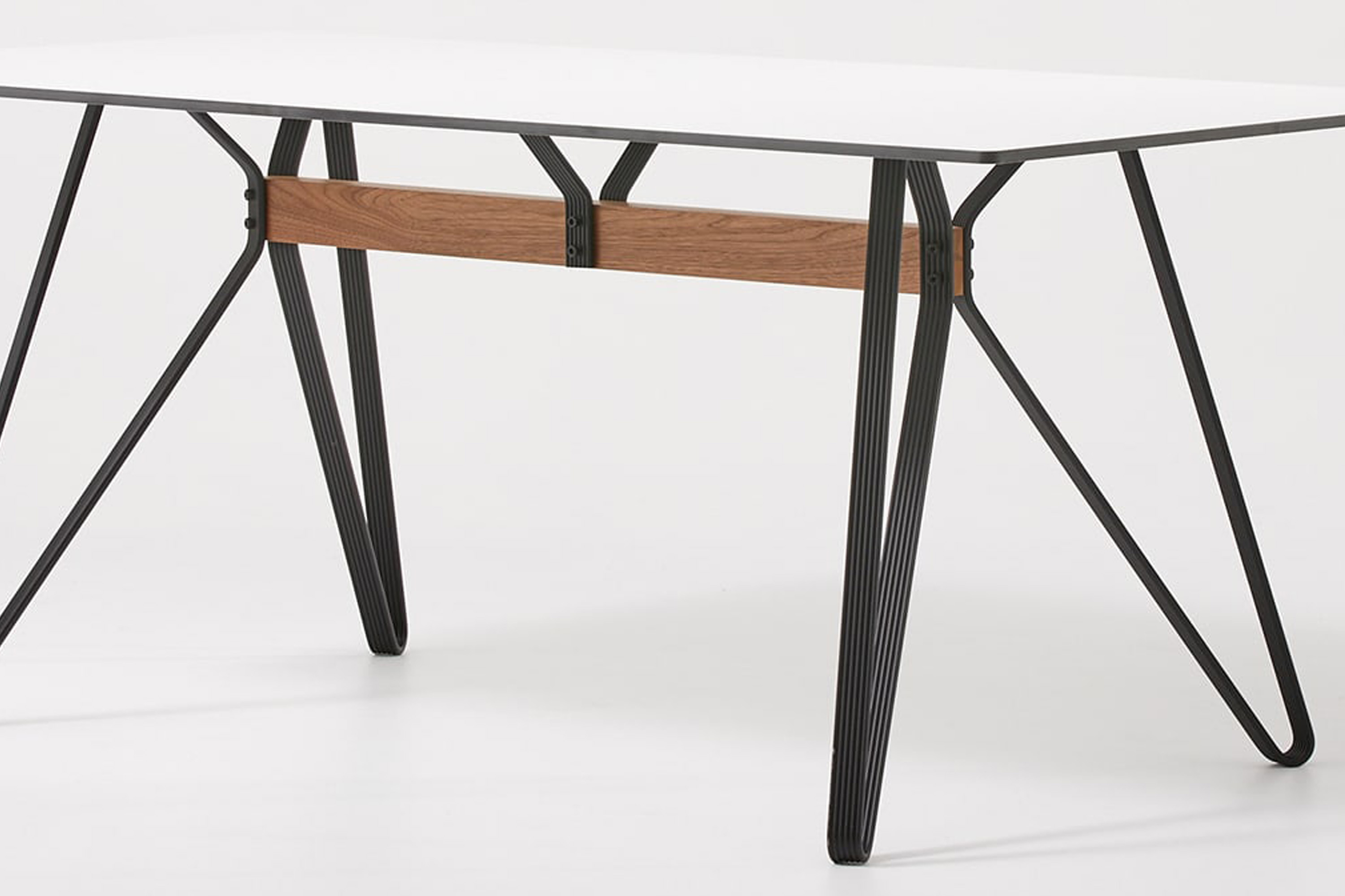 The assembly of extruded Aluminium legs, a solid oak beam and a tabletop produces a strong and flexible system that can be configured in a wide variety of sizes, with customisable material and colour combinations.