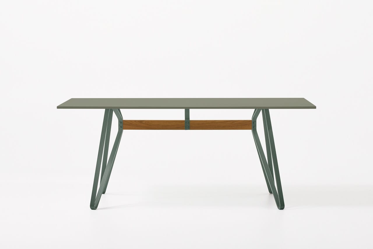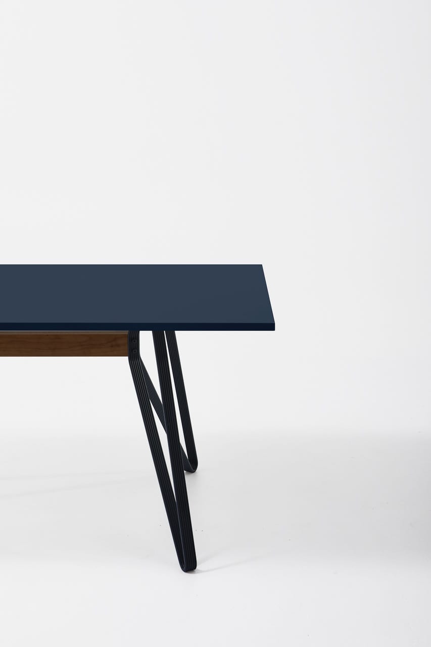 The assembly of extruded Aluminium legs, a solid oak beam and a tabletop produces a strong and flexible system that can be configured in a wide variety of sizes, with customisable material and colour combinations.