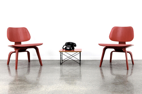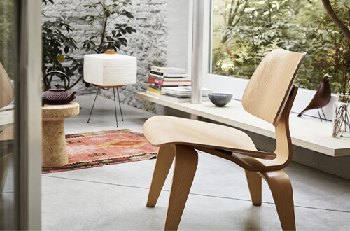 You can tell it’s Eames at a glance. Lounge chair, dining chair. Both with wood or chrome-plated steel legs.