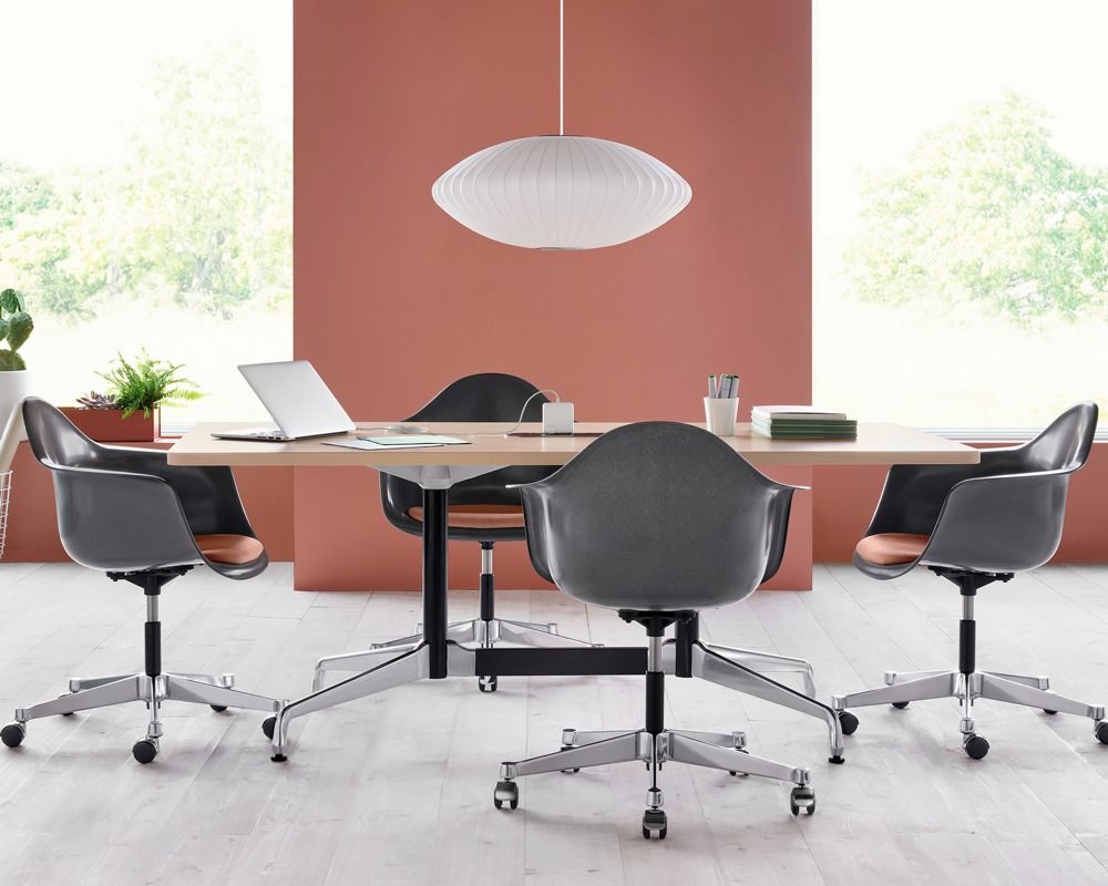 It beckons with an aesthetic and biomorphic shape that have become archetypal: the Eames moulded shell, prized since 1950 for inventing a new paradigm for simple and comfortable, sophisticated and playful seating. In this iteration as the Eames Task Chair, the iconic chair steps up its service as a desk chair that provides effortless functionality and flexibility.