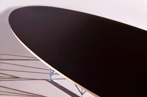 The tabletop consists of a seven-ply Baltic birch core sandwiched between high-pressure black or white laminate. The edge is bevelled on an angle to give the top added emphasis.