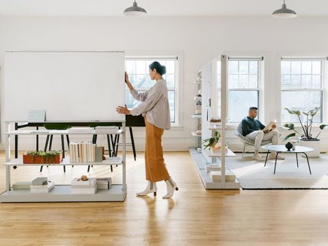 The OE1 Agile Wall is available with options like shelves, writable and tackable surfaces, and technology. So people can create spaces with