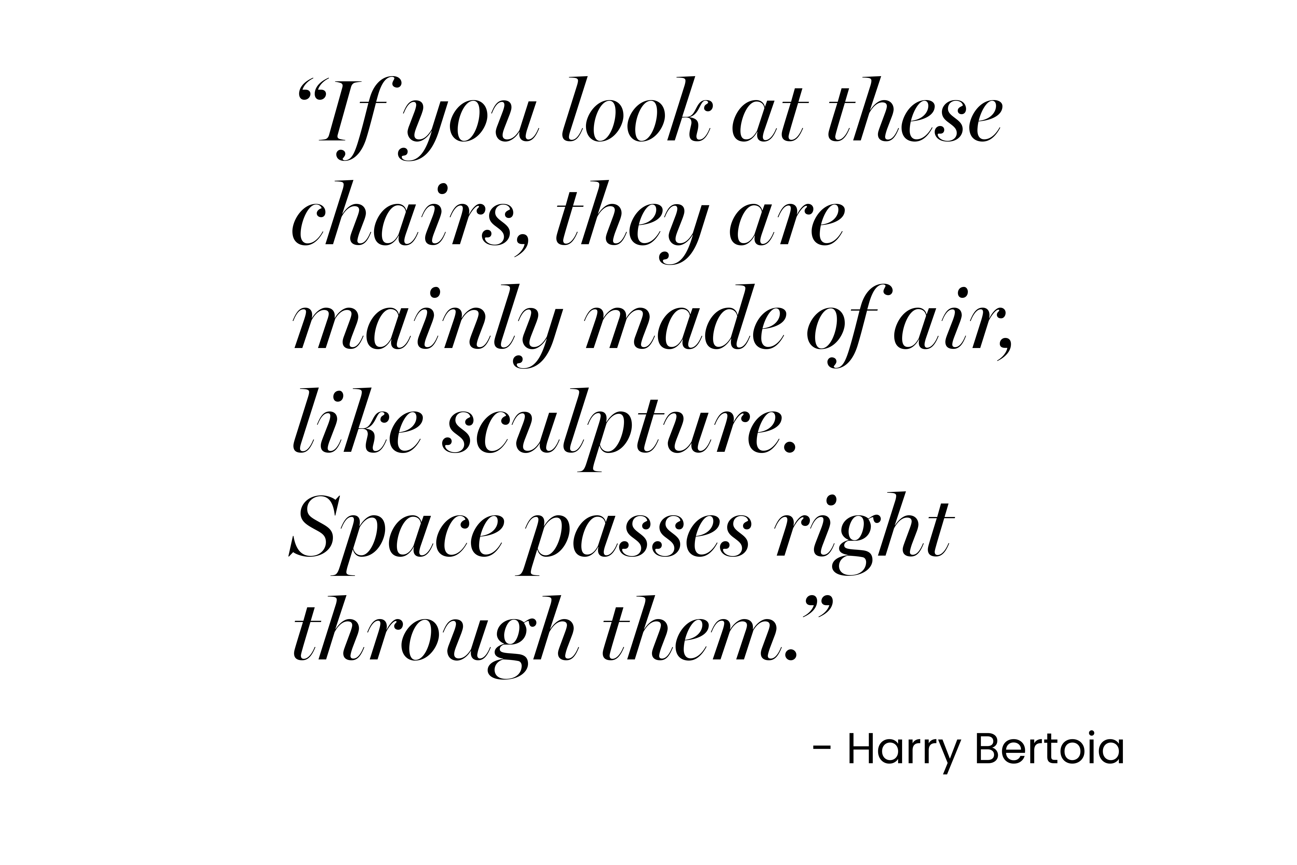 Characteristic of the early environment at Knoll, Hans and Florence never demanded that Bertoia design furniture, but instead encouraged him to explore whatever he liked. They simply asked that if he arrived at something interesting, to show them. Bertoia later explained the process:
