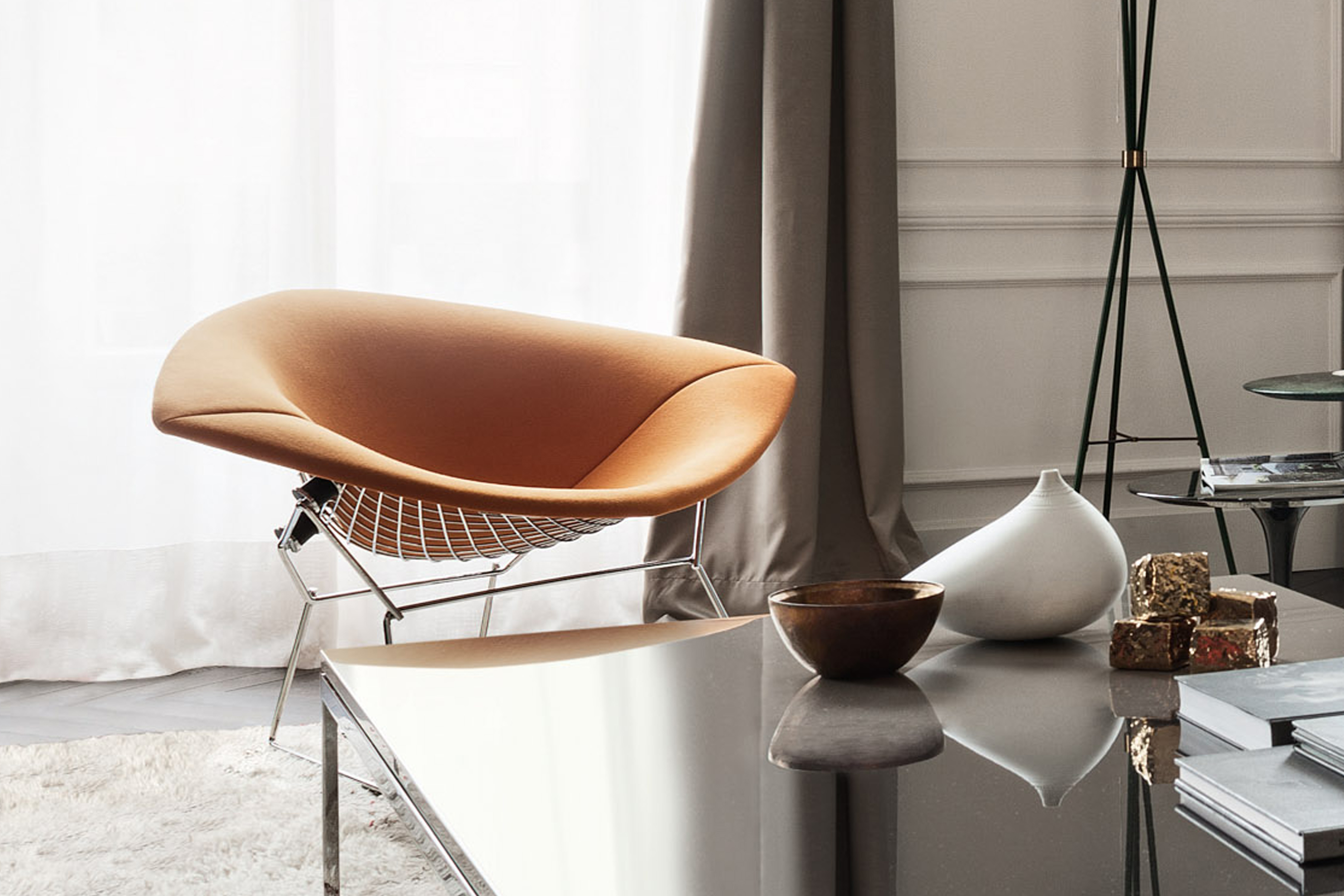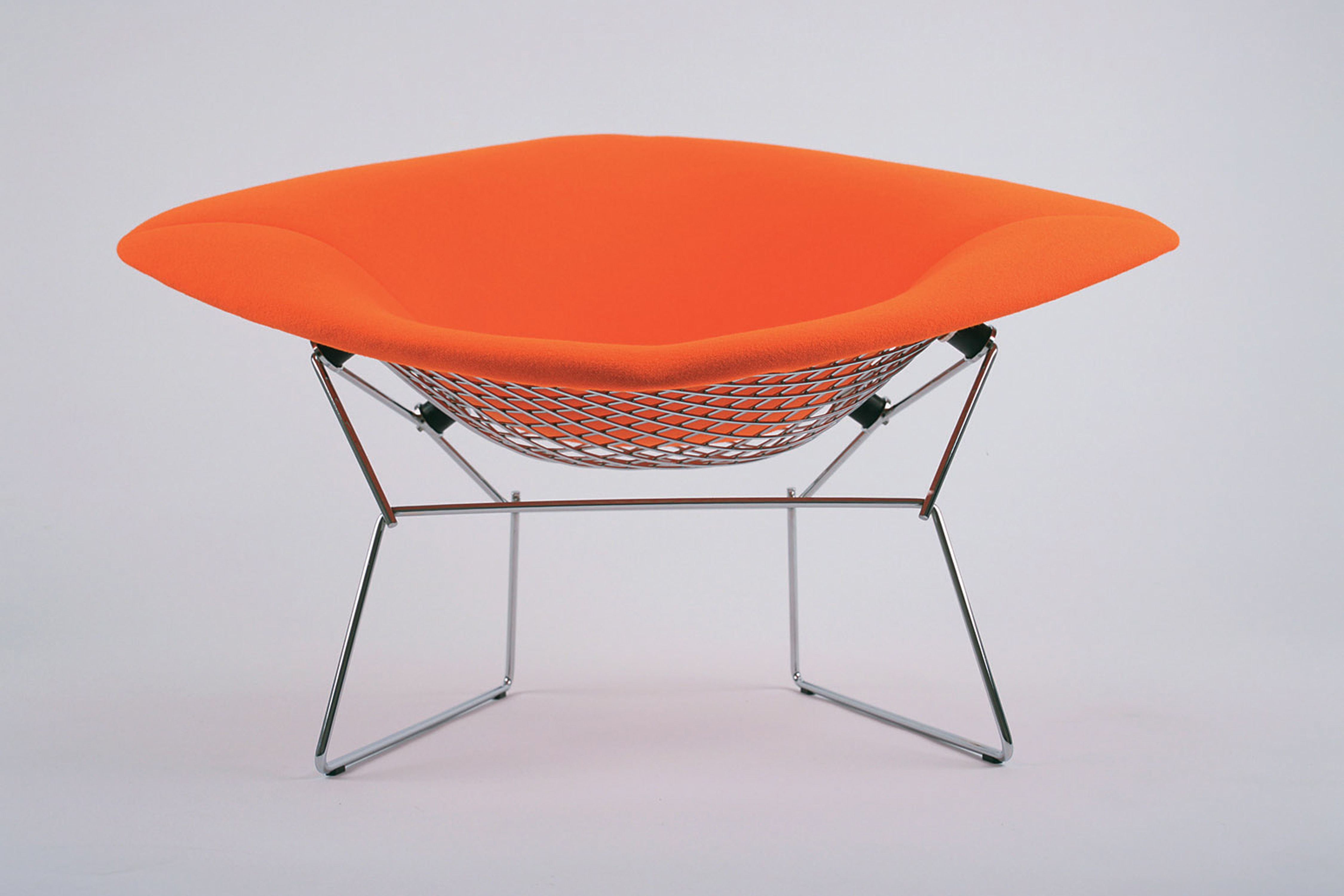 The Large Diamond Chair is an astounding study in space, form and function by one of the master sculptors of the last century. Like Saarinen and Mies, Bertoia found sublime grace in an industrial material, elevating it beyond its normal utility into a work of art. Harry Bertoia’s wire chairs are among the most recognized achievements of mid-century modern design and a proud part of the Knoll heritage.