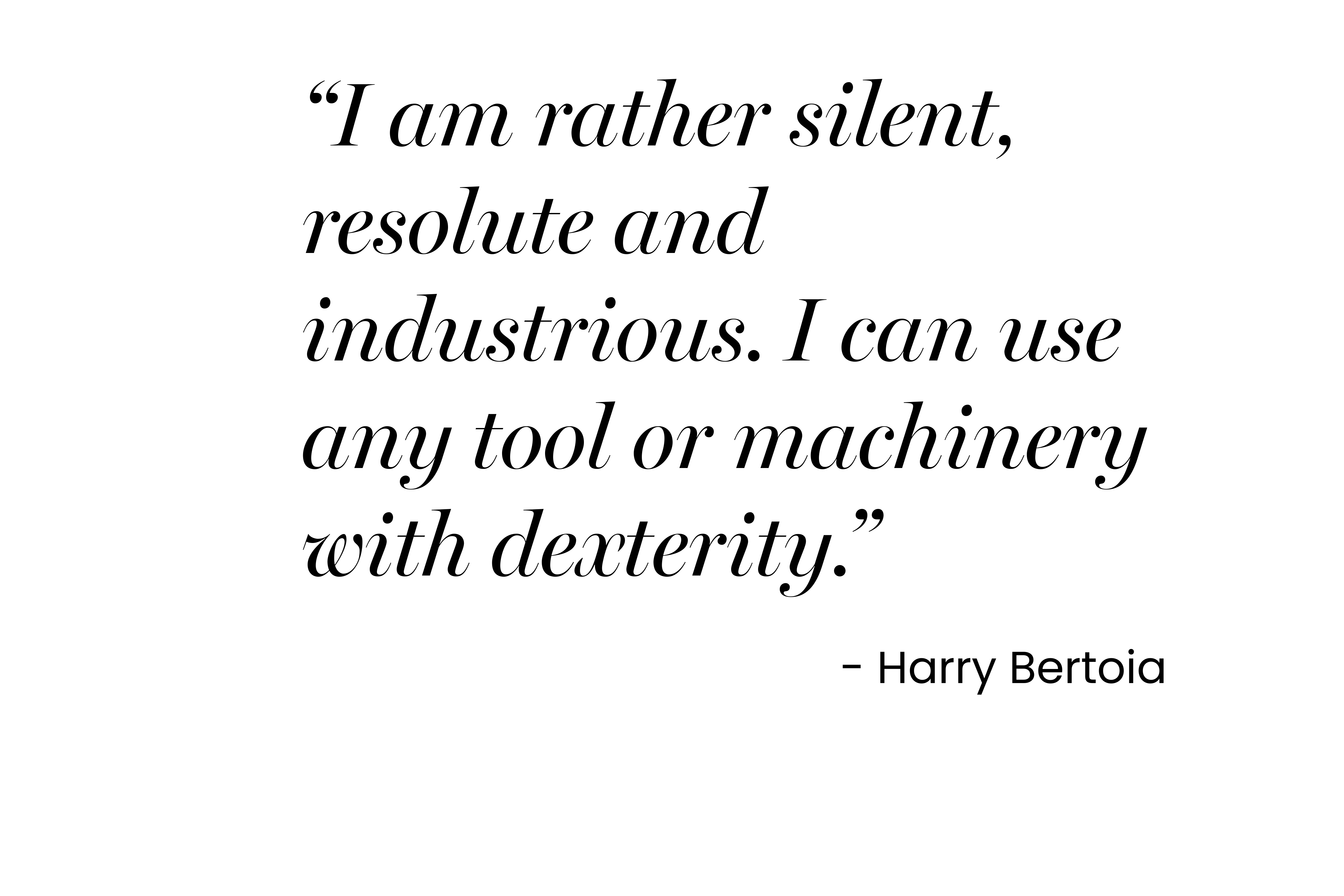 Characteristic of the early environment at Knoll, Hans and Florence never demanded that Bertoia design furniture, but instead encouraged him to explore whatever he liked. They simply asked that if he arrived at something interesting, to show them. Bertoia later explained the process: