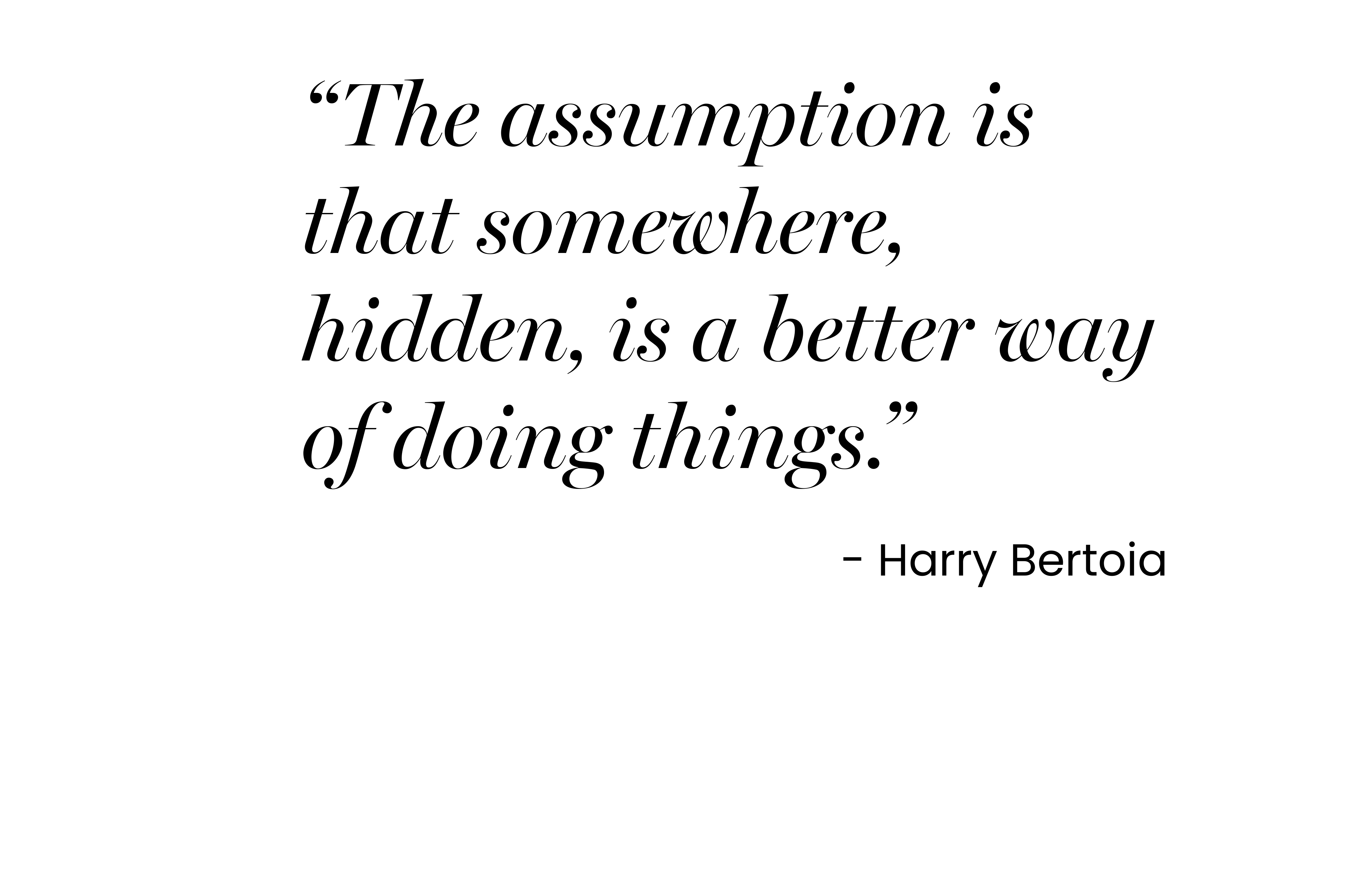 Characteristic of the early environment at Knoll, Hans and Florence never demanded that Bertoia design furniture, but instead encouraged him to explore whatever he liked. They simply asked that if he arrived at something interesting, to show them. Bertoia later explained the process: