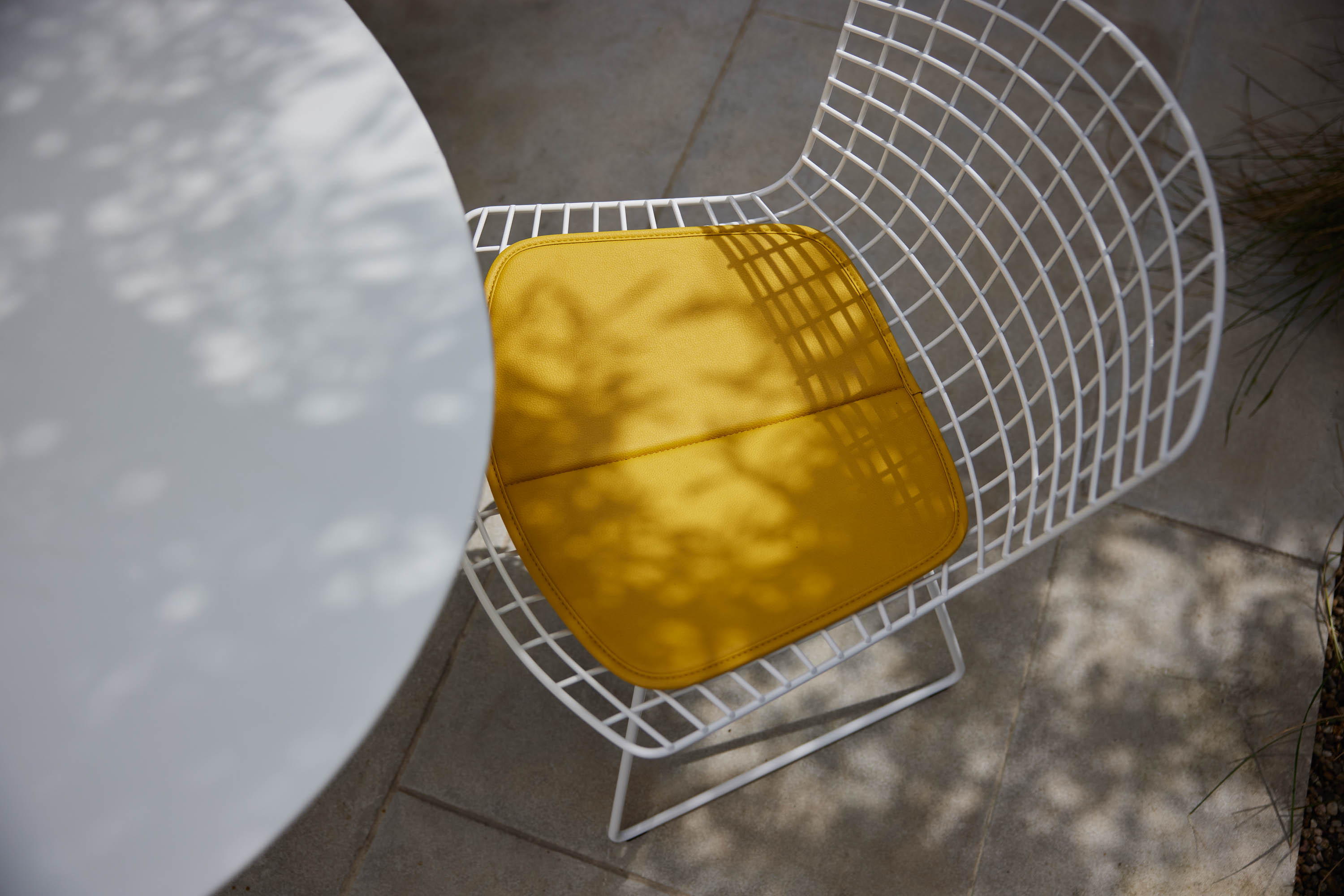 The Bertoia side chair is available with a seat pad or fully upholstered. A back pad is also an option for the version with seat pad. The Knoll logo is stamped into the base of the chair.