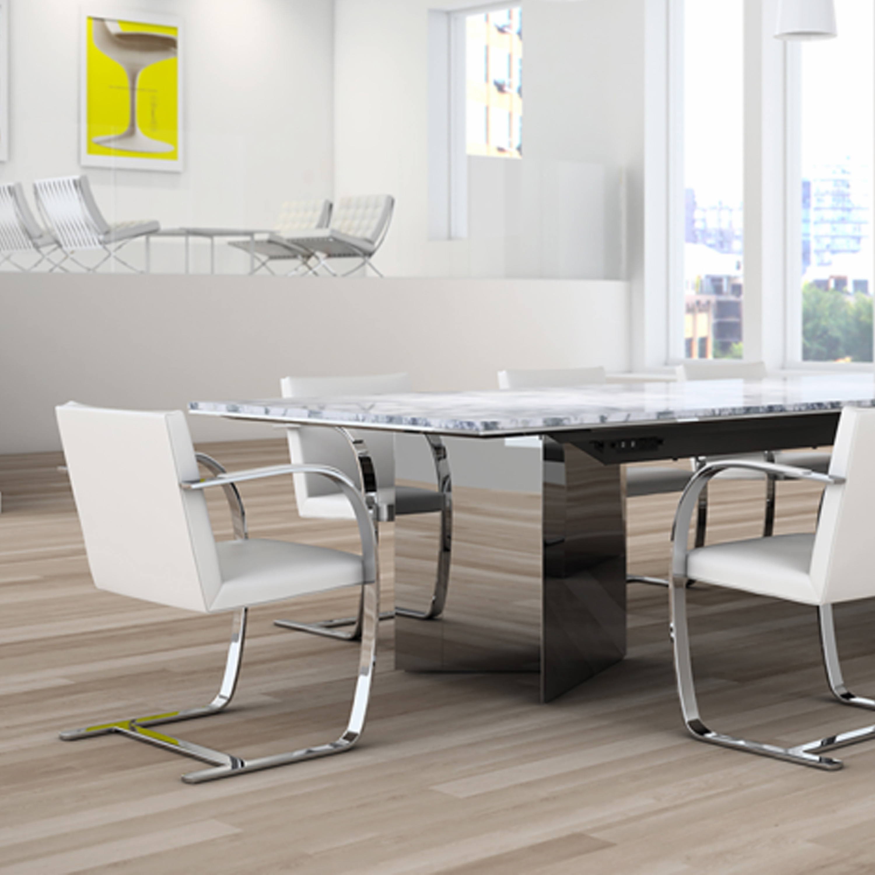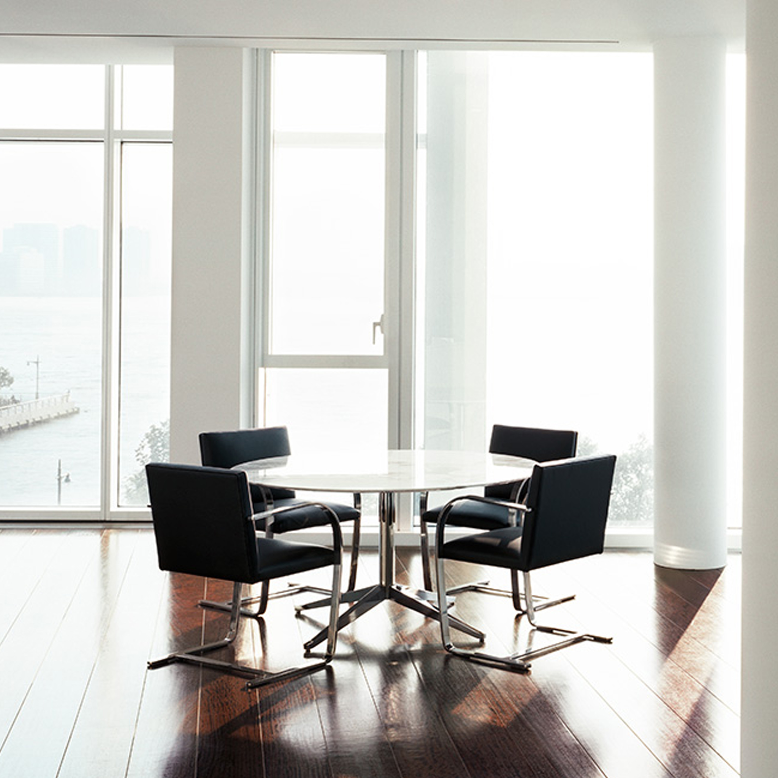 While there were 24 Tubular Brno Chairs in the Tugendhat House, there was only one Flat Bar Brno chair in master bedroom and, unlike the tubular version, the design was not subsequently put into production. In 1958 Phillip Johnson requested that Knoll produce the flat bar Brno Chair for use in his design of the Four Seasons restaurant. After making a few slight adjustments, including added cushioning — all with the approval of Mies — Knoll reintroduced the chair in 1958 and continues to produce each chair to Mies’ exacting standards, thanks to a collaboration with the Mies van der Rohe Archives at The Museum of Modern Art, New York.