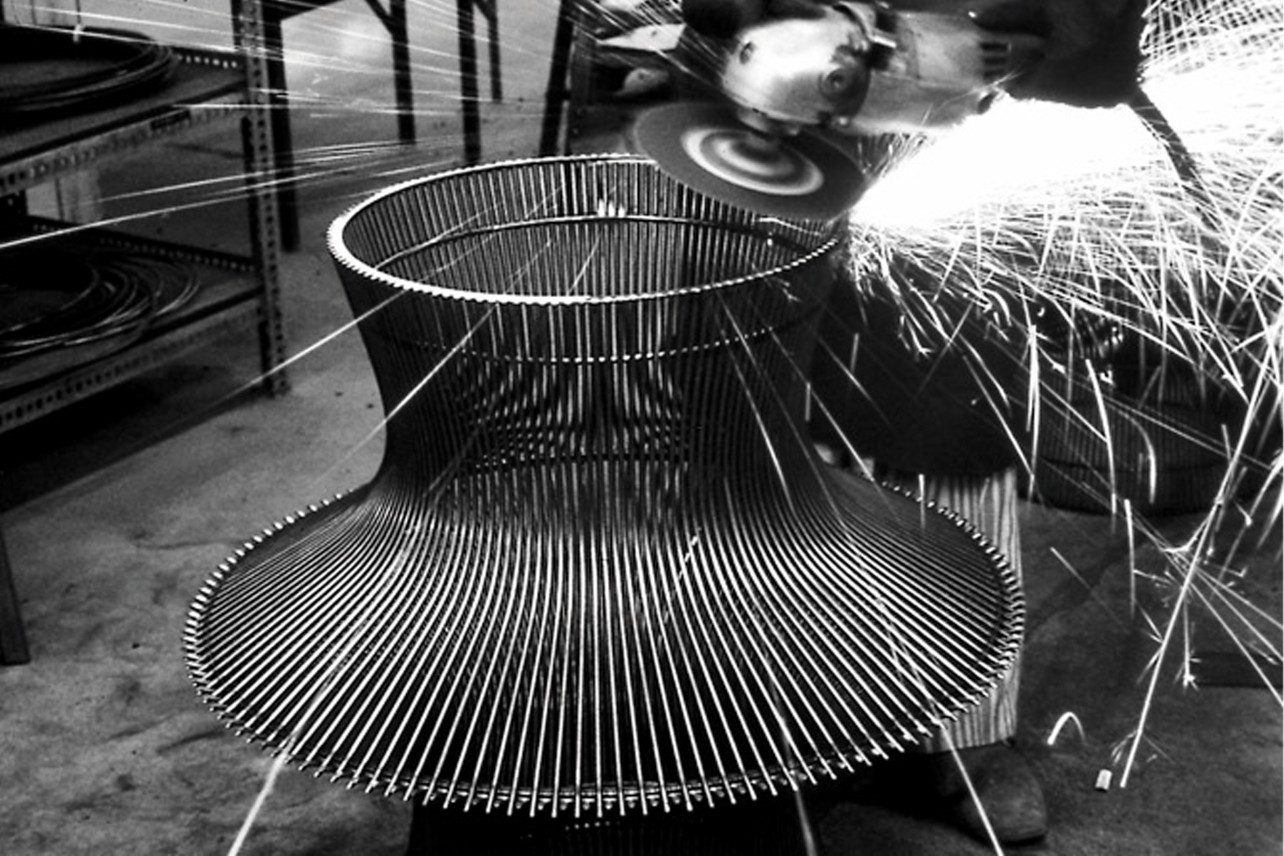 In 1966, the Platner Collection captured the "decorative, gentle, graceful" shapes that were beginning to infiltrate the modern vocabulary. The iconic pieces are created by welding hundreds of curved steel rods to circular frames, simultaneously serving as structure and ornament.