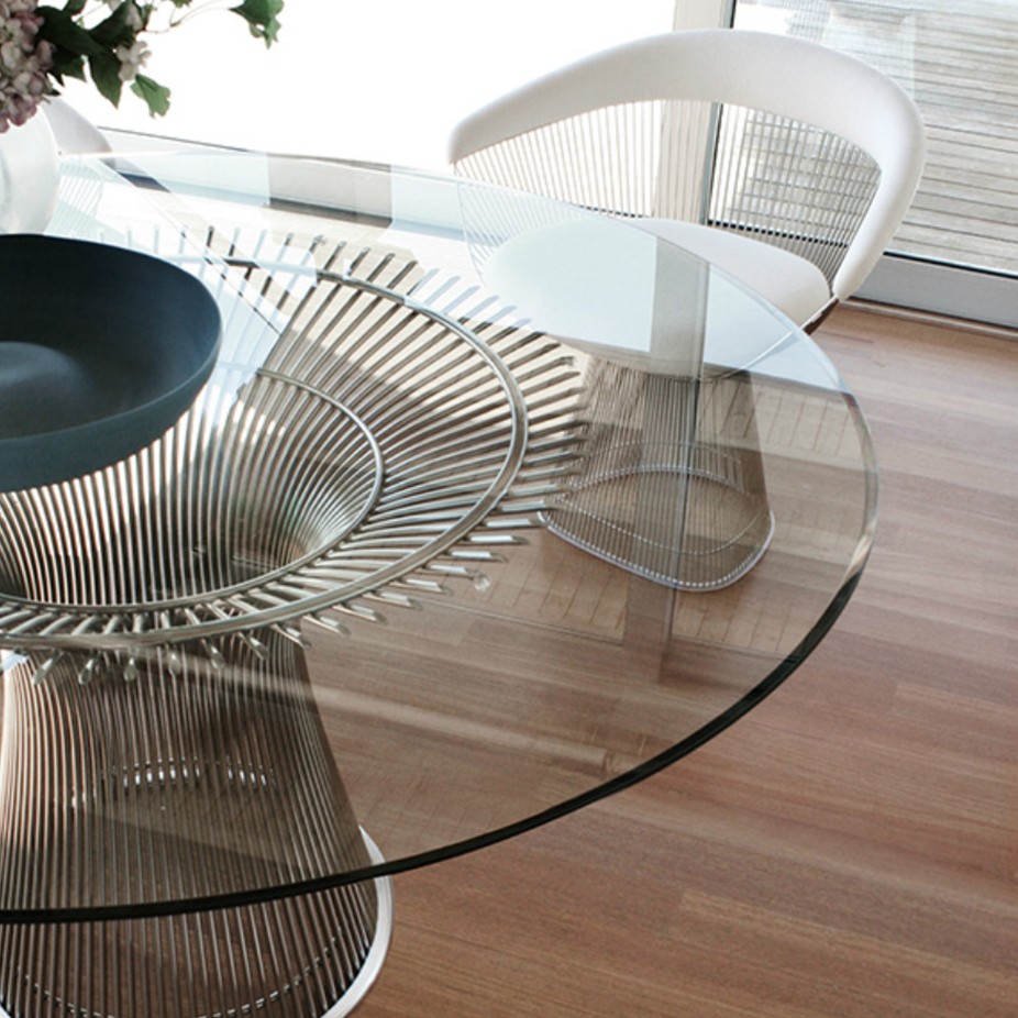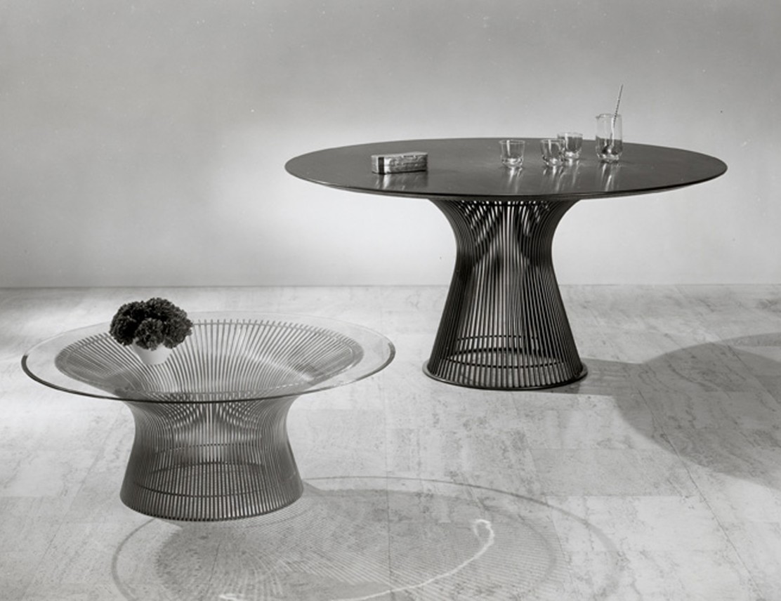 In 1966, the Platner Collection captured the “decorative, gentle, graceful” shapes that were beginning to infiltrate the modern vocabulary. The iconic dining table, which creates a focal point for any dining room, is created by welding curved steel rods to circular frames, simultaneously serving as structure and ornament. 70" table seats 8-9. 60" table seats 7-8 people.