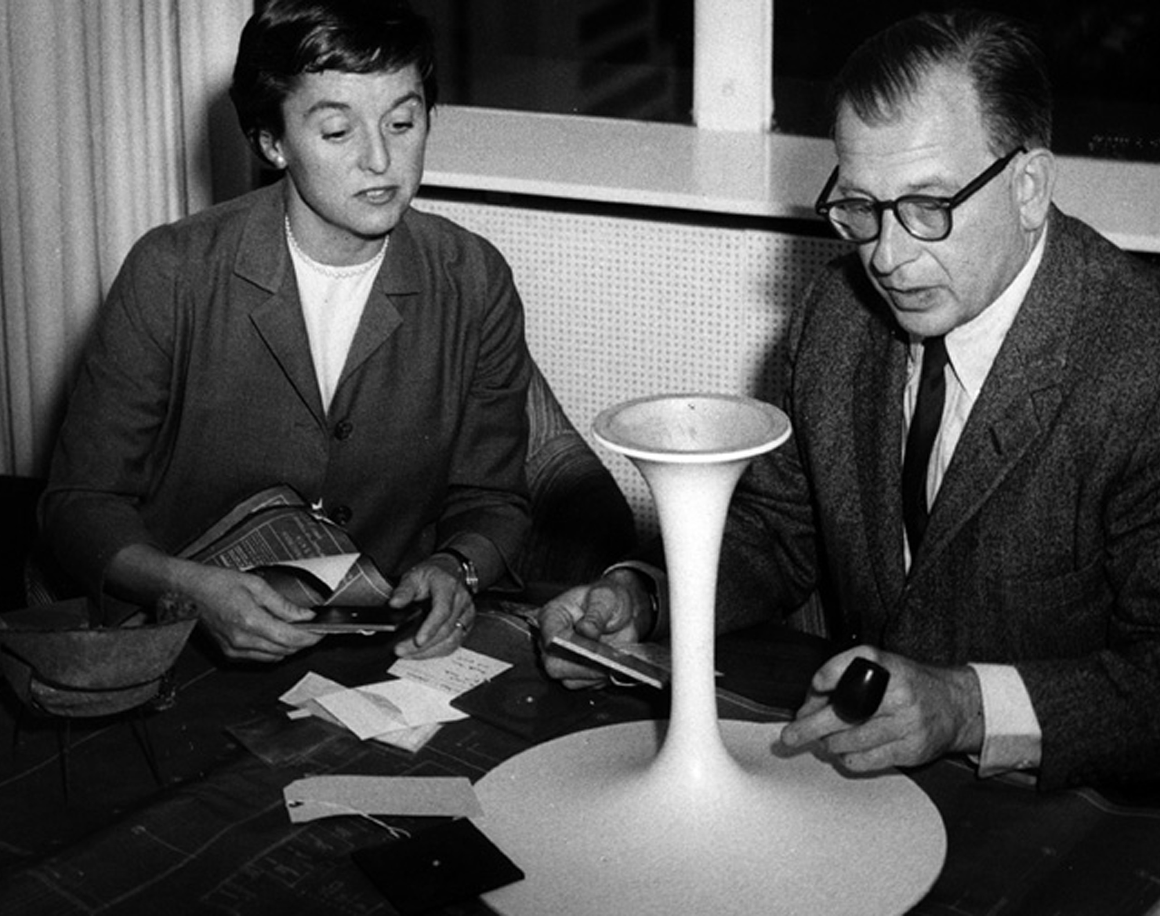 Saarinen was assisted by Don Petitt, of Knoll’s Design Development Group, who introduced several ingenious methods of model making. Together with a Knoll design research team, they worked out the problems arising in production. Full scale models became furniture and, with family and friends acting as “guinea pigs,” the furniture was tested in the dining room and living room of the Saarinen house in Bloomfield Hills.