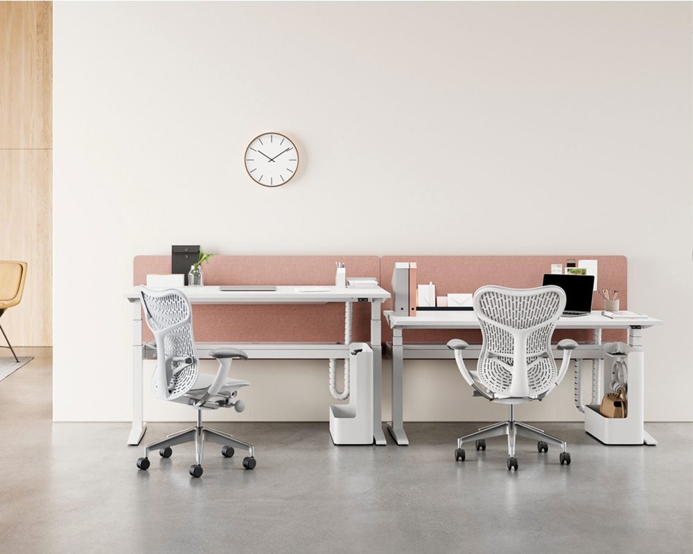 desks in both rectangular- and round-leg versions. In multi-desk settings, the round-leg Ratio comes with castors, while the