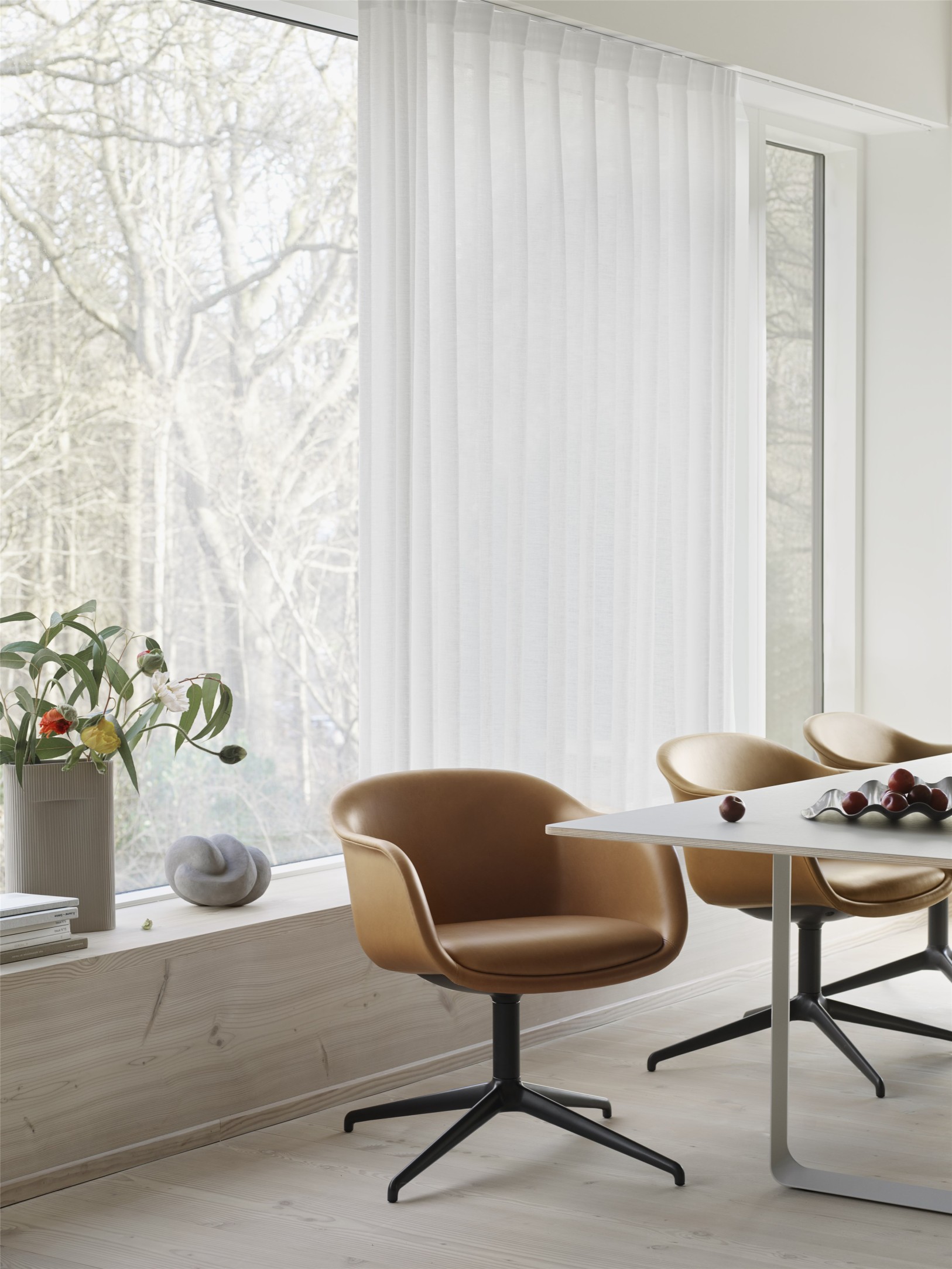 MATERIALS | Shell: Shell from 100% recycled plastic mixed with strength-improving additives. The recycled plastic comes from post-consumer waste. Seat, Back + Armrest: clad with multiple layers of foam and wadding and finished with textile, imitation leather or leather upholstery. Leather from selected premium leather suppliers. Swivel Base: Aluminium. Pressurised gas lift cylinder in steel. Plastic glides or Castors. Tube Base: Powder coated steel. Plastic glides. Wood Base: FSC™-certified (FSC-C028824) oak with water-based lacquer. For Stained Dark Brown version only: Please note that slight colour variations can occur due to the inherent characteristics of the material. Plastic glides.