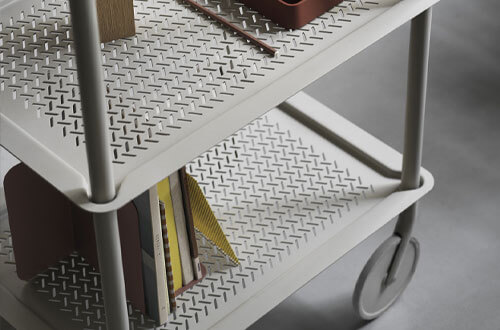 The Flow Trolley brings the concept of functional design into a modern context through its grooved trays in embossed metal for a