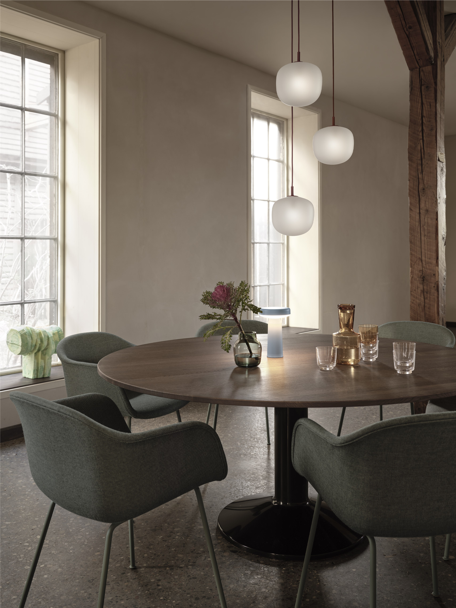The Rime Pendant Lamp brings an elegant perspective to the glass pendant lamp through its semi-transparent glass that has been sandblasted for a refined expression. The design features a characteristic form, inspired by the shape of acorns, complemented by its powder-coated top-part, pendant tube and cord in a matching color for a subtle touch. The design is available in four colors across four sizes, allowing you to use the design on its own or in linear formations or playful clusters for a modern chandelier.