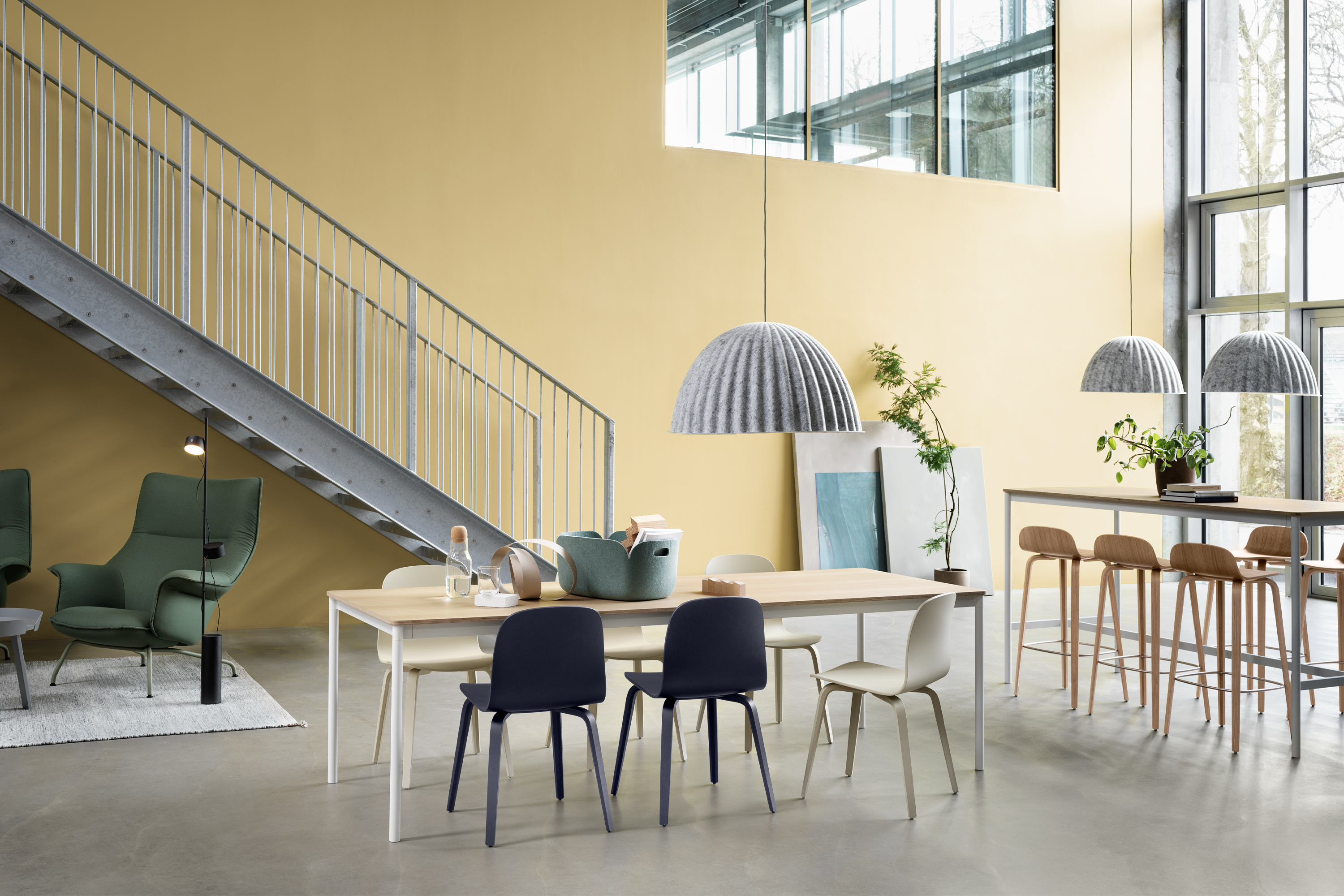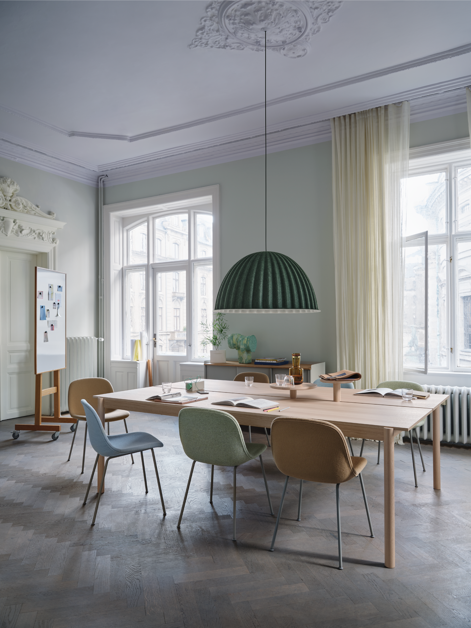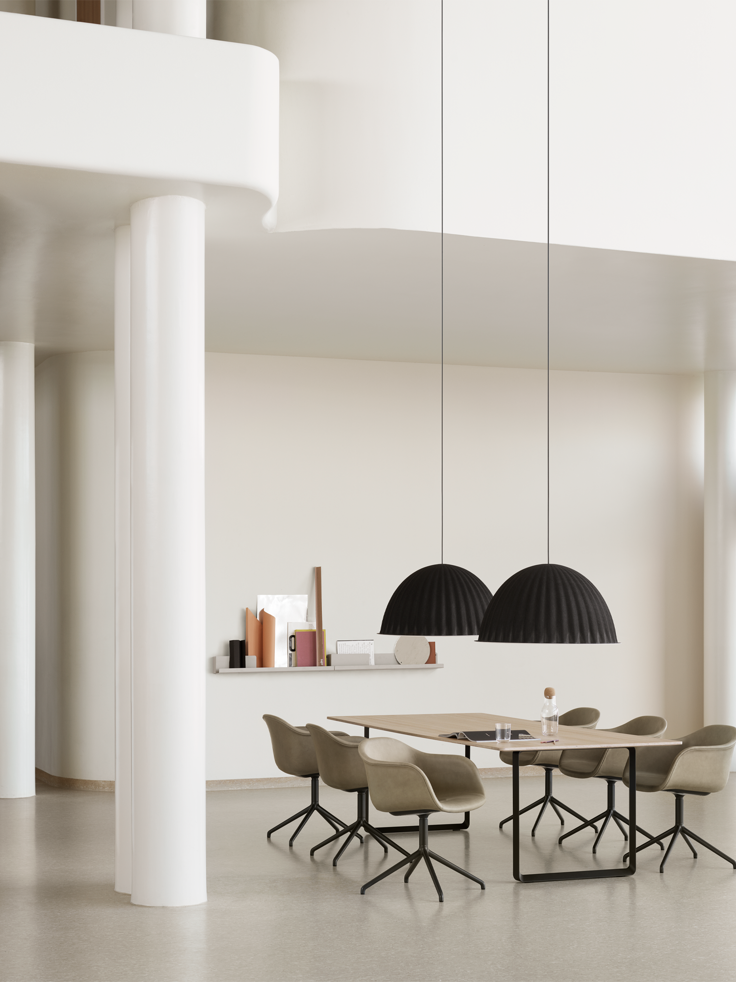 Designed in a material that uses 49% fibers made from recycled plastic, the Under The Bell Pendant Lamp not only brings a tactile and modern expression to any space but also impacts the acoustics of a room through its soft shade, paired with its graphic lines and subtle color palette.
