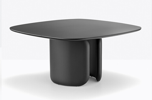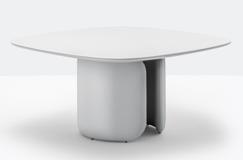 The base is formed of two moulded elements of fixed dimensions, made from rigid polyurethane foam and upholstered in genuine leather; they support a square table top in ultra-thin 6mm solid laminate, with rounded lacquered MDF support beneath it which conceals the steel structure.