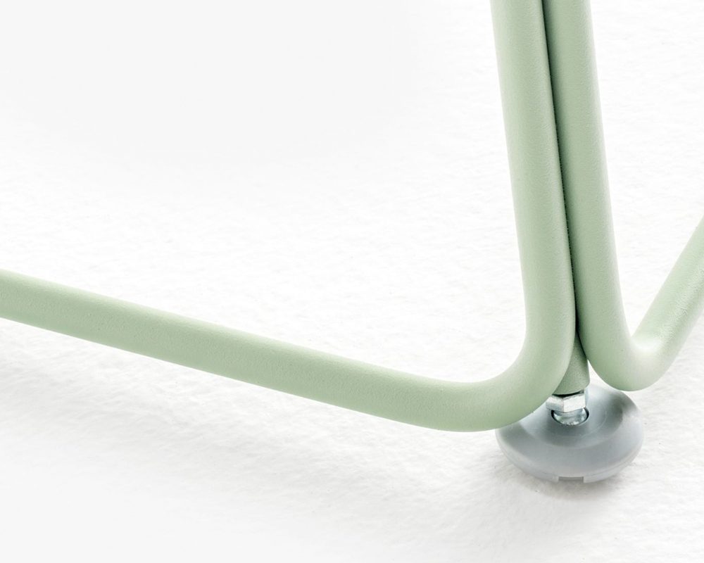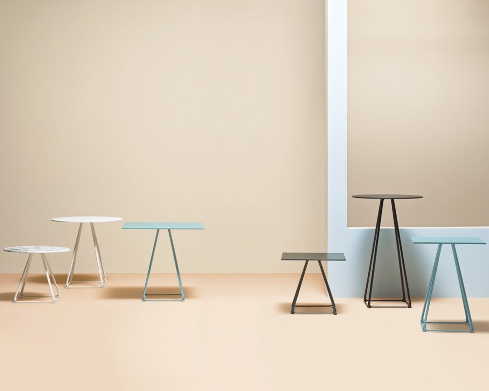 The base consists of four trapezoidal steel rods and can be combined with tops of different sizes and finishes.