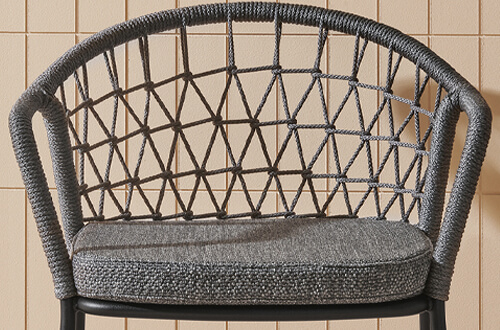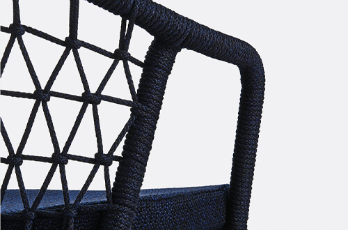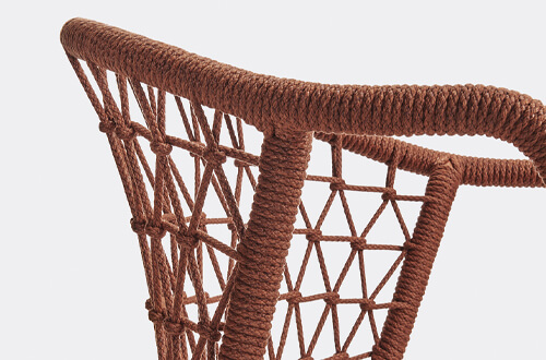 An armchair featuring a traditional element in polypropylene cord hand-woven in Italy that wraps around the Ø 20 mm steel tube frame.