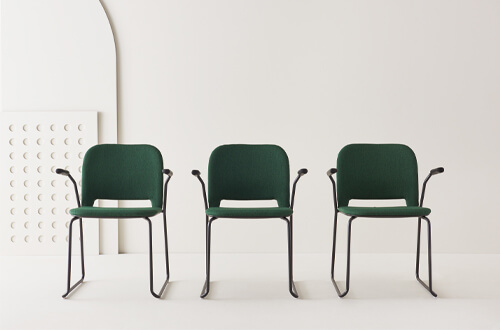 An upholstered chair with or without armrests enriched by some accessories like ganging device or anti-panic writing tablet.