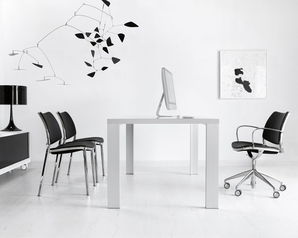 Gas swivel chairs always come with armrests. Finish of the frame for swivel chairs: shiny chrome, or powder coated in black or white.