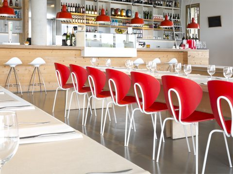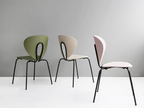 The seat and backrest are made of veneered multiply, finished in natural wood, wood lacquered or in polypropylene.