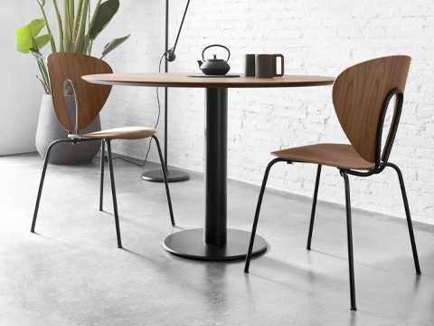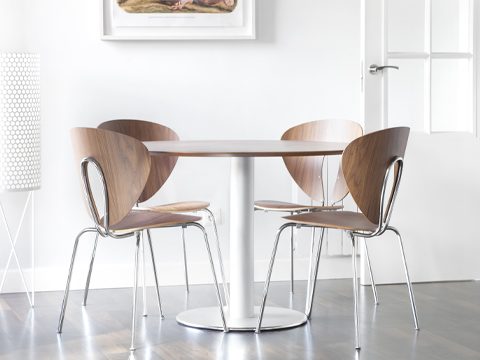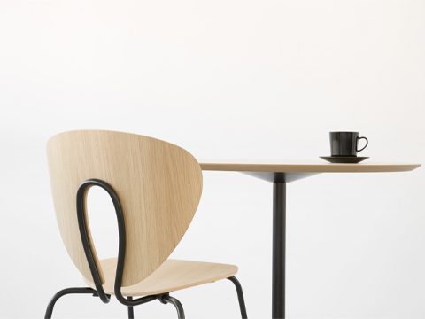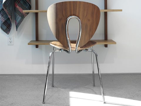 The seat and backrest are made of veneered multiply, finished in natural wood, wood lacquered or in polypropylene.