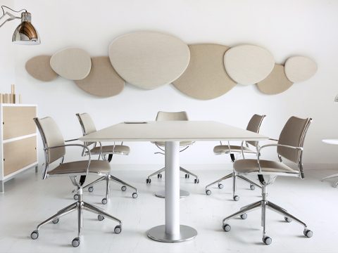 The acoustic panels are made with noise-reduction foam cladded onto a wooden board and covered with fabrics from the STUA collection. The